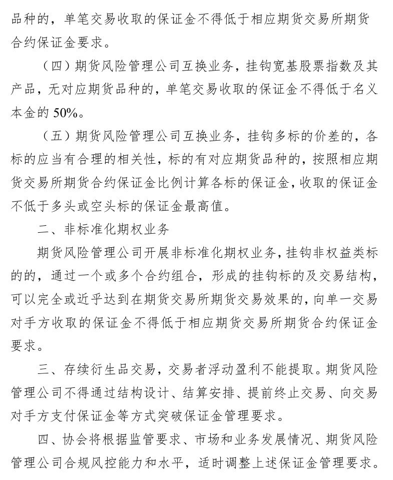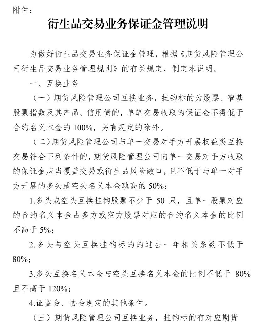 期货风险管理公司互换业务,挂钩标的为股票、窄基股票指数及其产品、信用债的,单笔交易收取的保证金不得低于合约名义本金的100%,另有规定的除外。